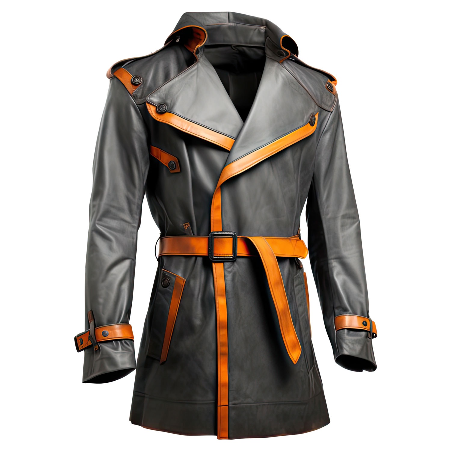 Men’s Charcoal Grey Orange Genuine Sheepskin Double Breasted Lapel Collar Winter Wear Belted Fashionable Trench Leather Coat