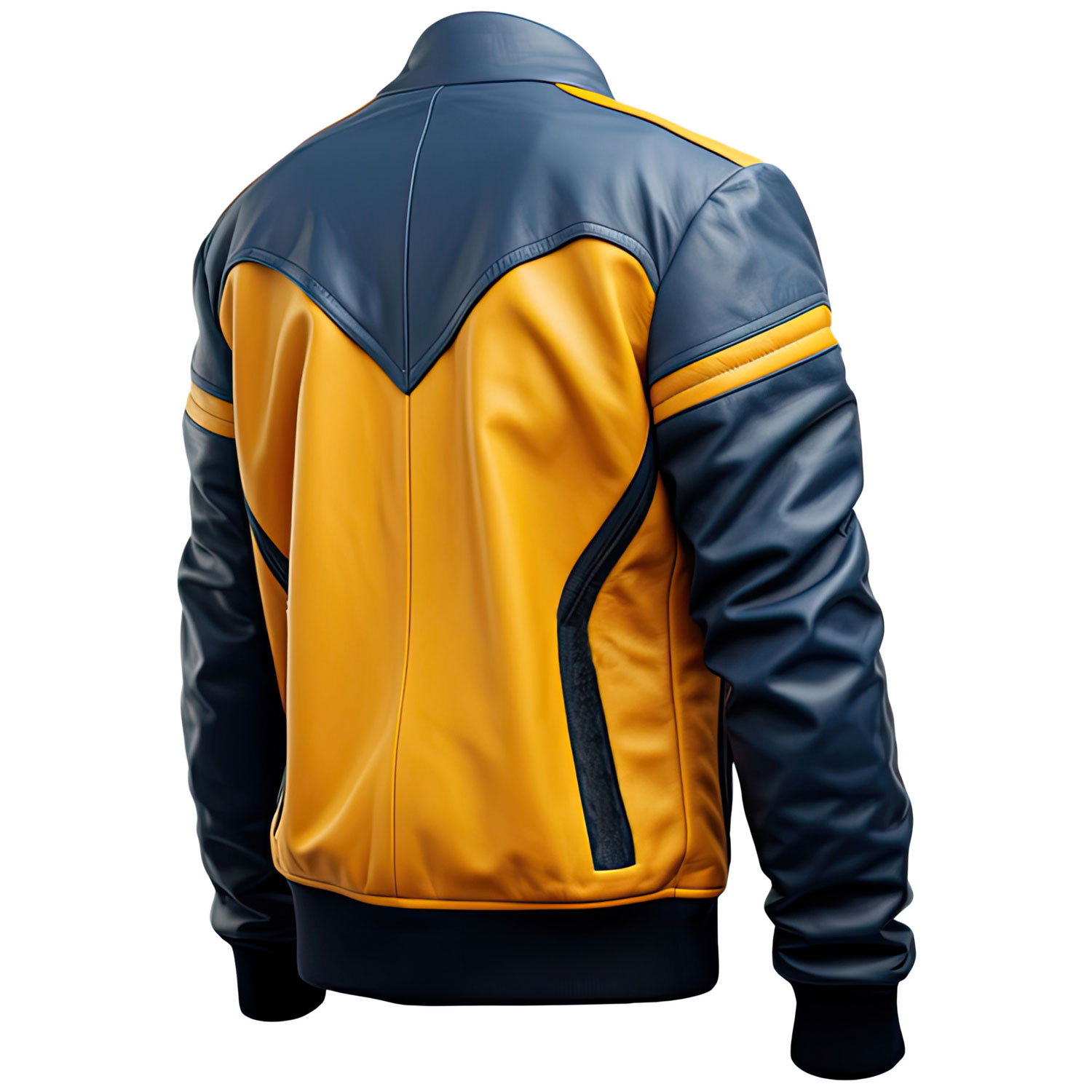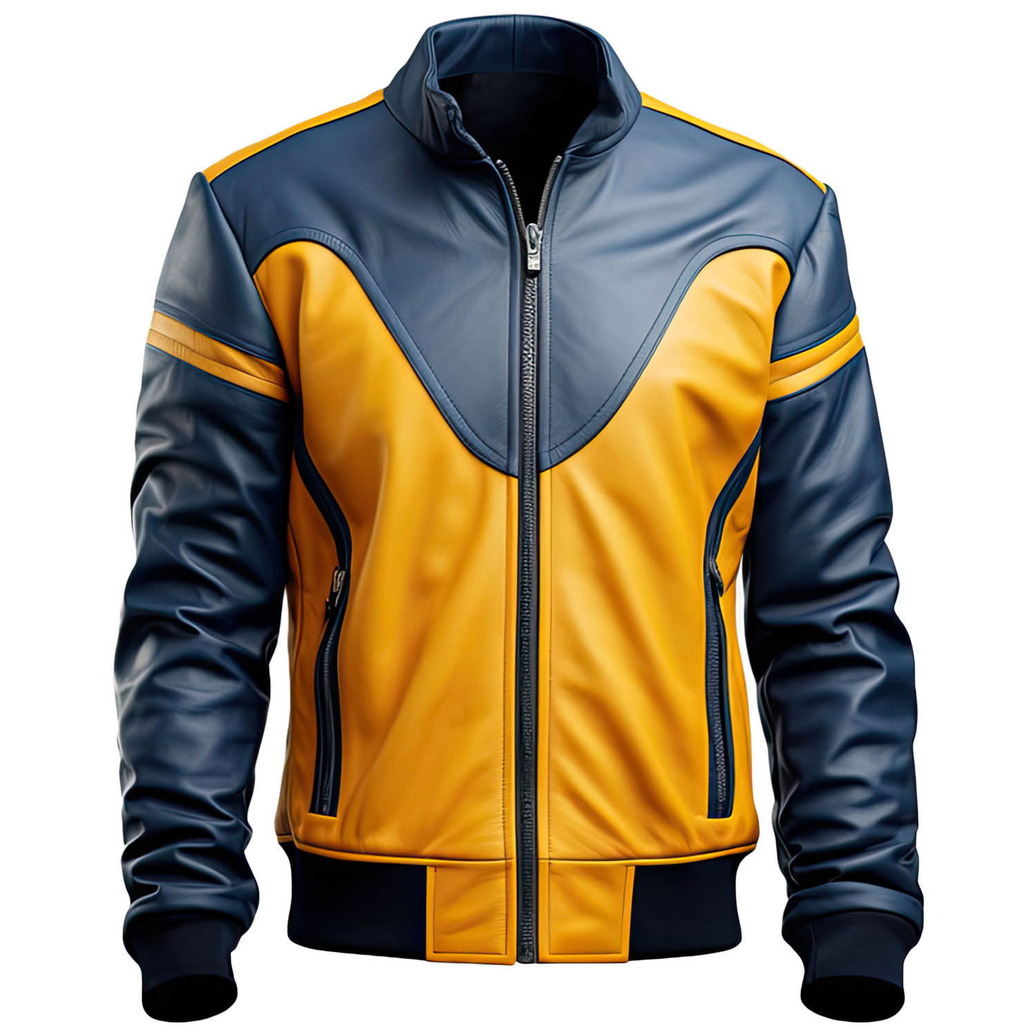 Introducing the Men’s Mustard Yellow Blue Genuine Sheepskin Stand Collar Smooth Motorbike Outfit Café Racer Zip-Up Smooth Bomber Leather Jacket, a vibrant addition to any fashion-forward wardrobe. This jacket is meticulously crafted from the finest genuine sheepskin leather, offering both superior durability and a soft, premium feel. The stand collar and front YKK zipper closure add a touch of sophistication, while the practical zipper pockets ensure your belongings are always secure. Rib knit cuffs and bottom hem provide a comfortable, custom fit, making it perfect for chilly rides or casual outings. The unique mustard yellow and blue color combination makes this jacket a standout piece, blending classic café racer style with a modern twist.