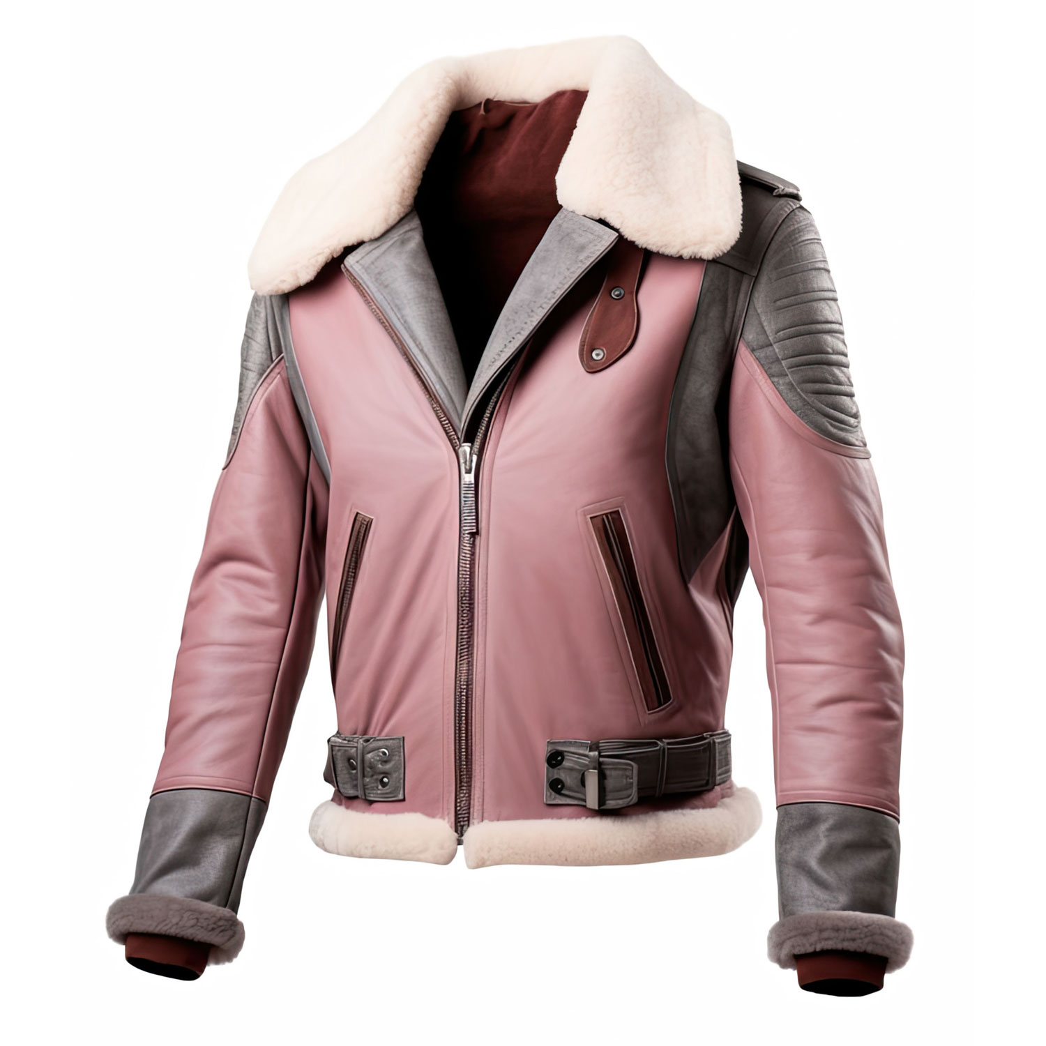 Elevate your winter wardrobe with the Men’s Pink Grey Genuine Sheepskin Sherpa Shearling Faux Fur Collar Aviator Pilot Warm Air Force Leather Jacket. This exquisite piece is a nod to classic aviation style, crafted from high-quality sheepskin leather in a unique pink and grey color. The Sherpa shearling faux fur collar, cuffs, and hem provide not only exceptional warmth but also a touch of timeless elegance. The slanted zipper pockets add practicality, and the adjustable waist buckle belt ensures a perfect fit. The jacket’s YKK zipper closure offers ease and durability, making it a reliable choice for any adventure. Ideal for those chilly days, this jacket combines the ruggedness of a pilot’s gear with modern fashion, ensuring you stay cozy and stylish.