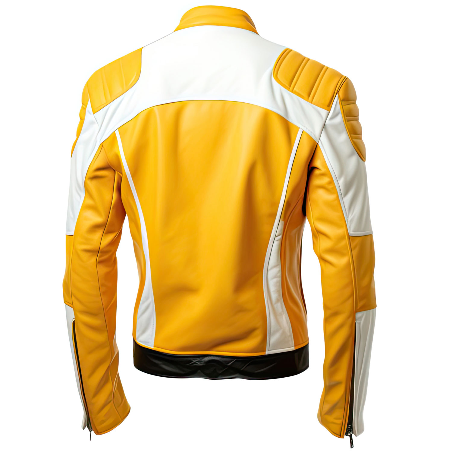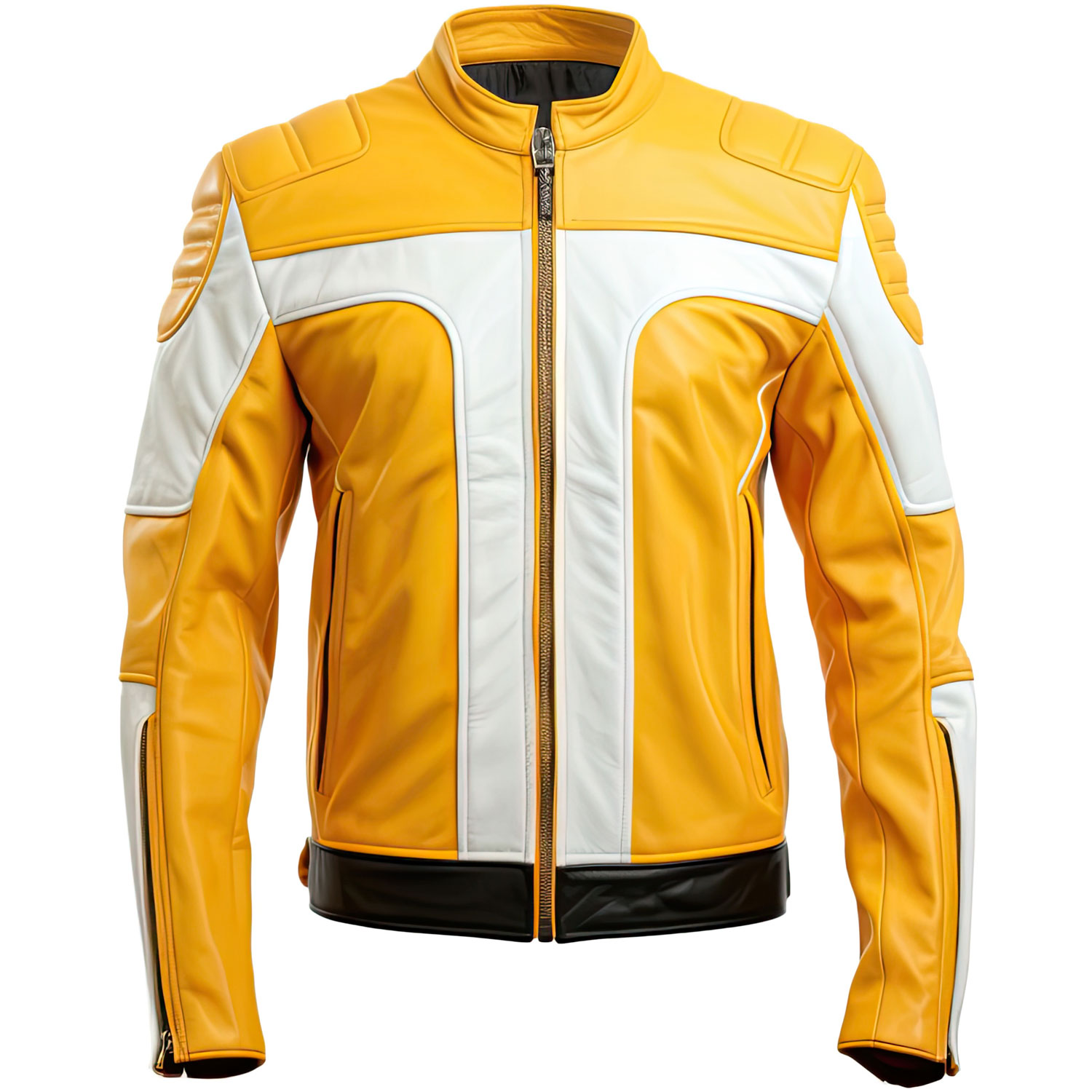 Elevate your fashion game with our men’s yellow white racer leather jacket. Made from authentic sheepskin, it ensures durability, comfort, and a touch of luxury. The stylish stand collar and secure YKK zipper front closure add sophistication to your outfit. Convenient slanted pockets not only enhance the jacket’s aesthetic but also offer practicality. For added comfort, this jacket features full sleeves, quilted shoulders, and zipper cuffs. It’s a versatile addition to your wardrobe, perfect for various occasions. Whether you’re heading out for a casual day or a night on the town, this jacket will make you stand out in style. Upgrade your fashion quotient with this must-have leather jacket today.